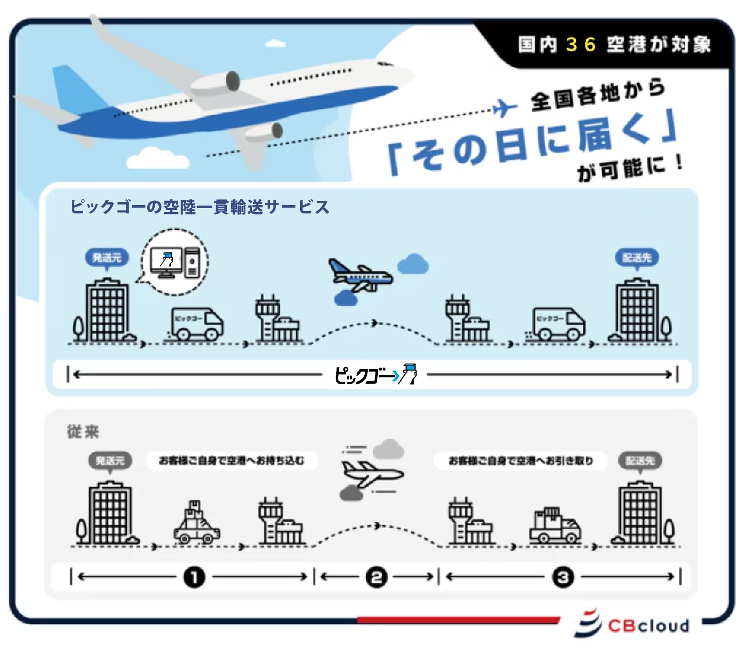 ▲ピックゴーの空陸一貫輸送の図解