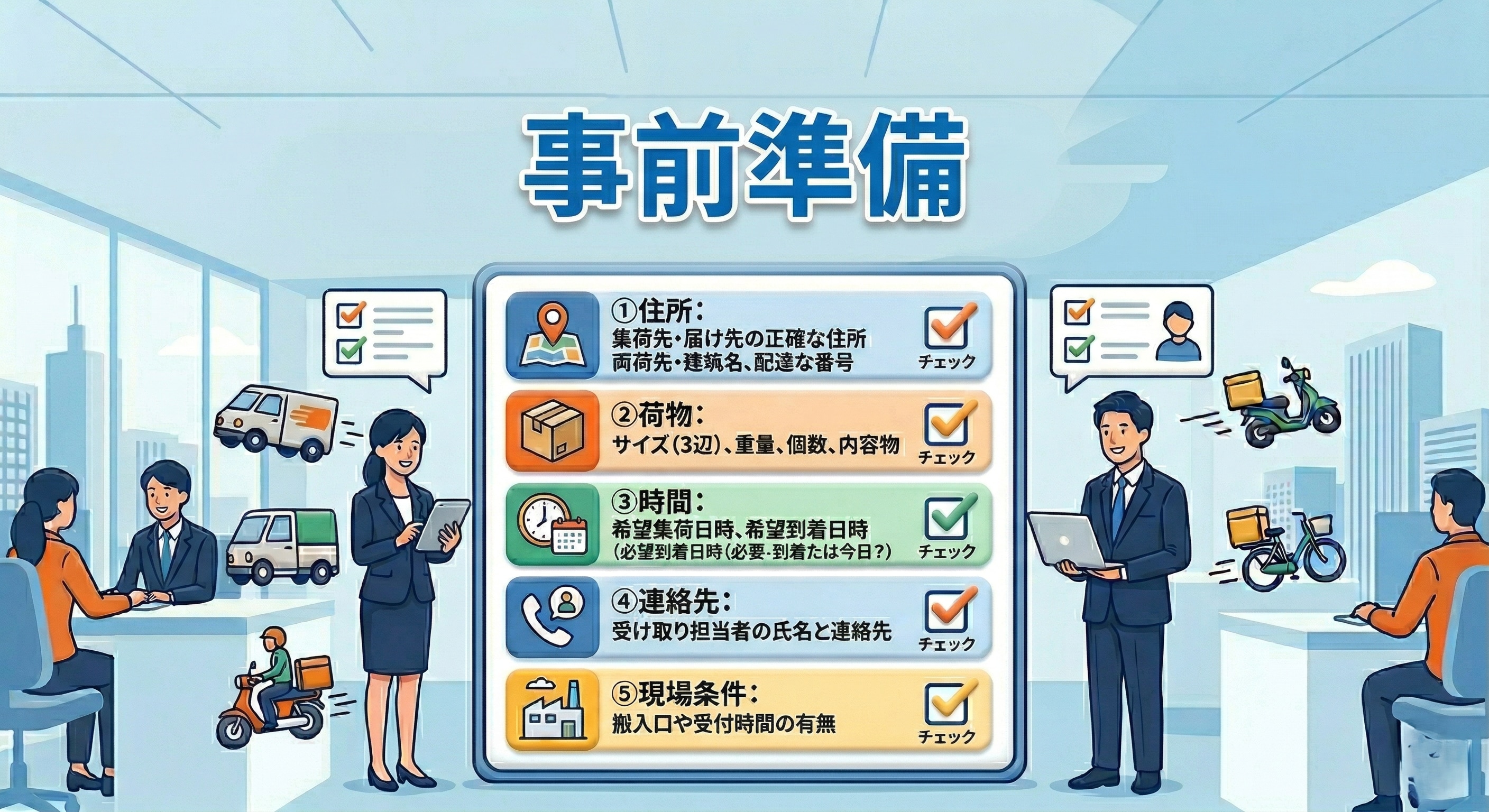 当日配送は、依頼が遅くなるほど選択肢が狭くなります。そのため、必要になってから慌てて問い合わせるよりも、「当日対応になるかもしれない」と分かった時点で見積もりの準備を始めるほうが安心です。