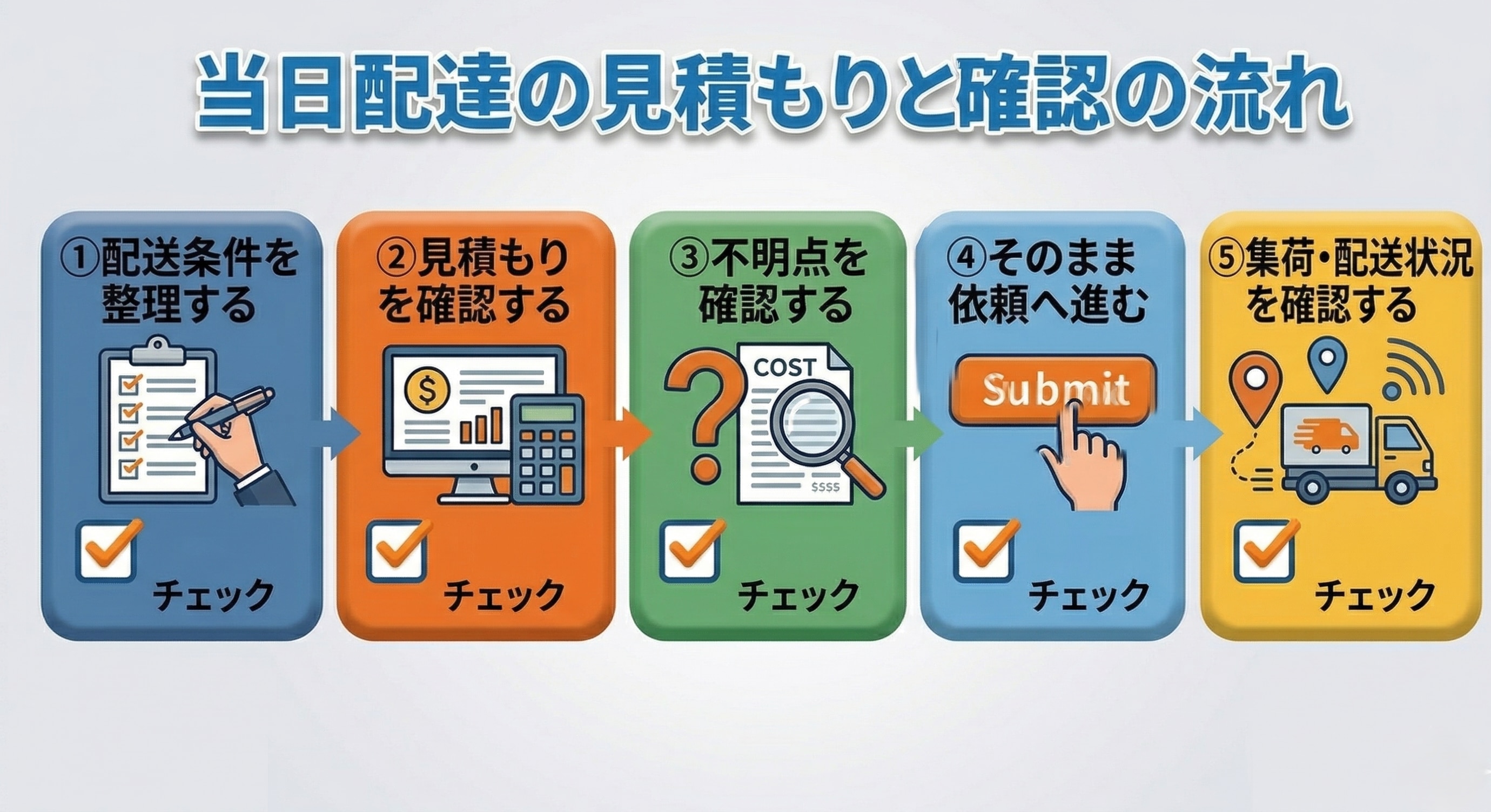 当日配達の見積もりは、情報が揃っていれば比較的スムーズに進められます。ここでは、見積もりから依頼判断までの流れを整理します。