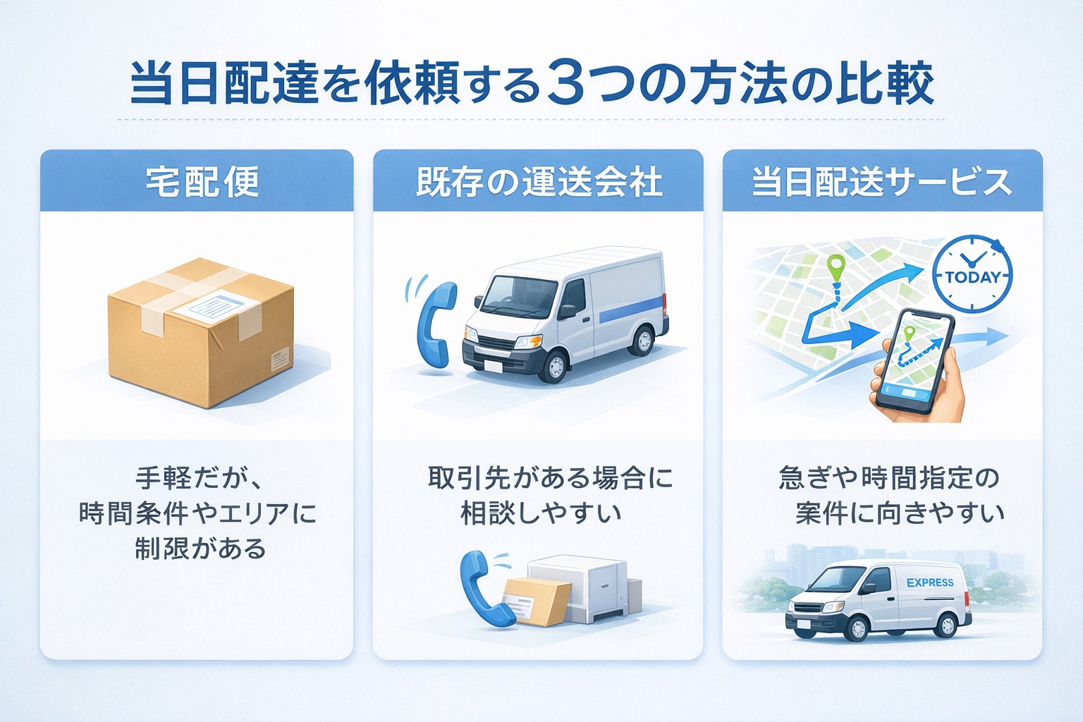 当日配達をどう依頼すればよいか迷ったときは、こうした専用サービスを選択肢に入れておくと、手配しやすくなります。