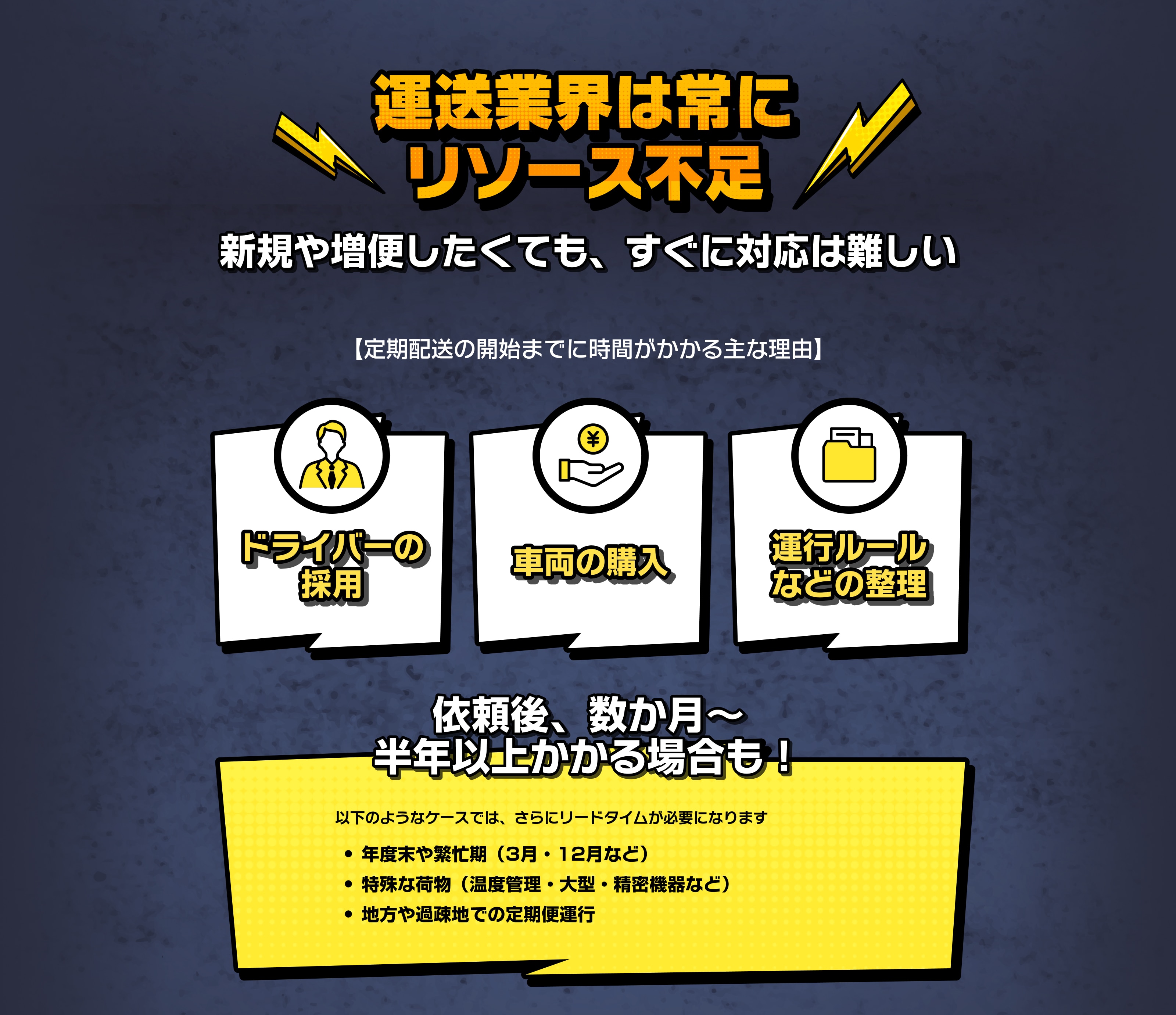 配送パートナーの手配状況にもよりますが、最短で翌日から配送可能です。