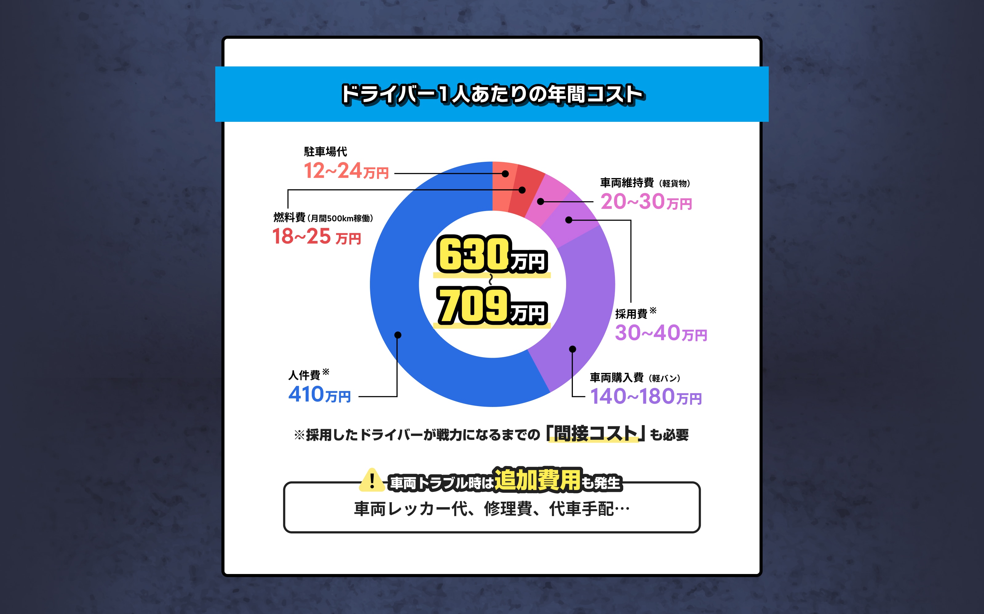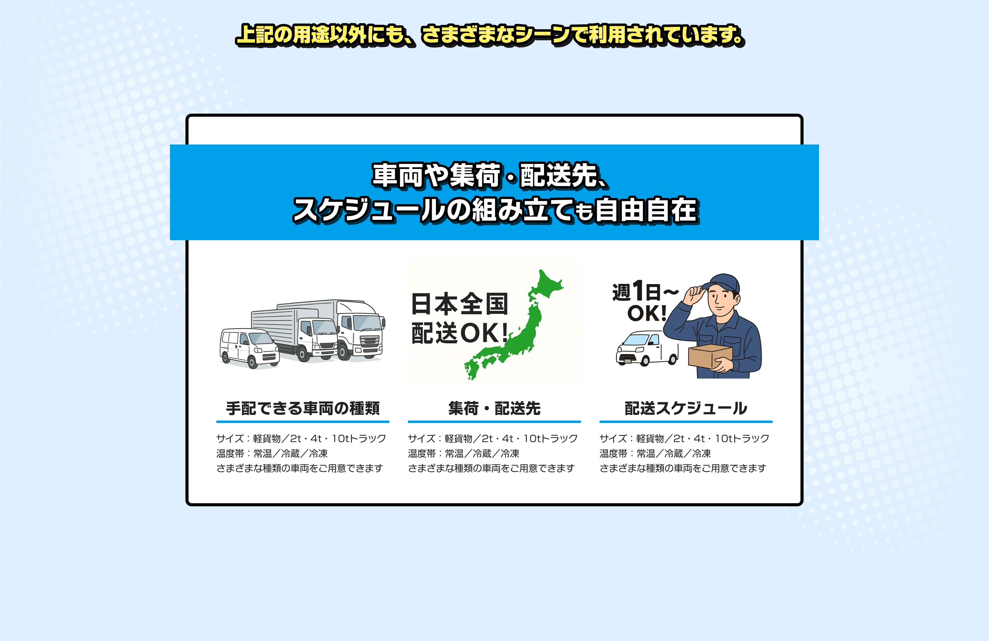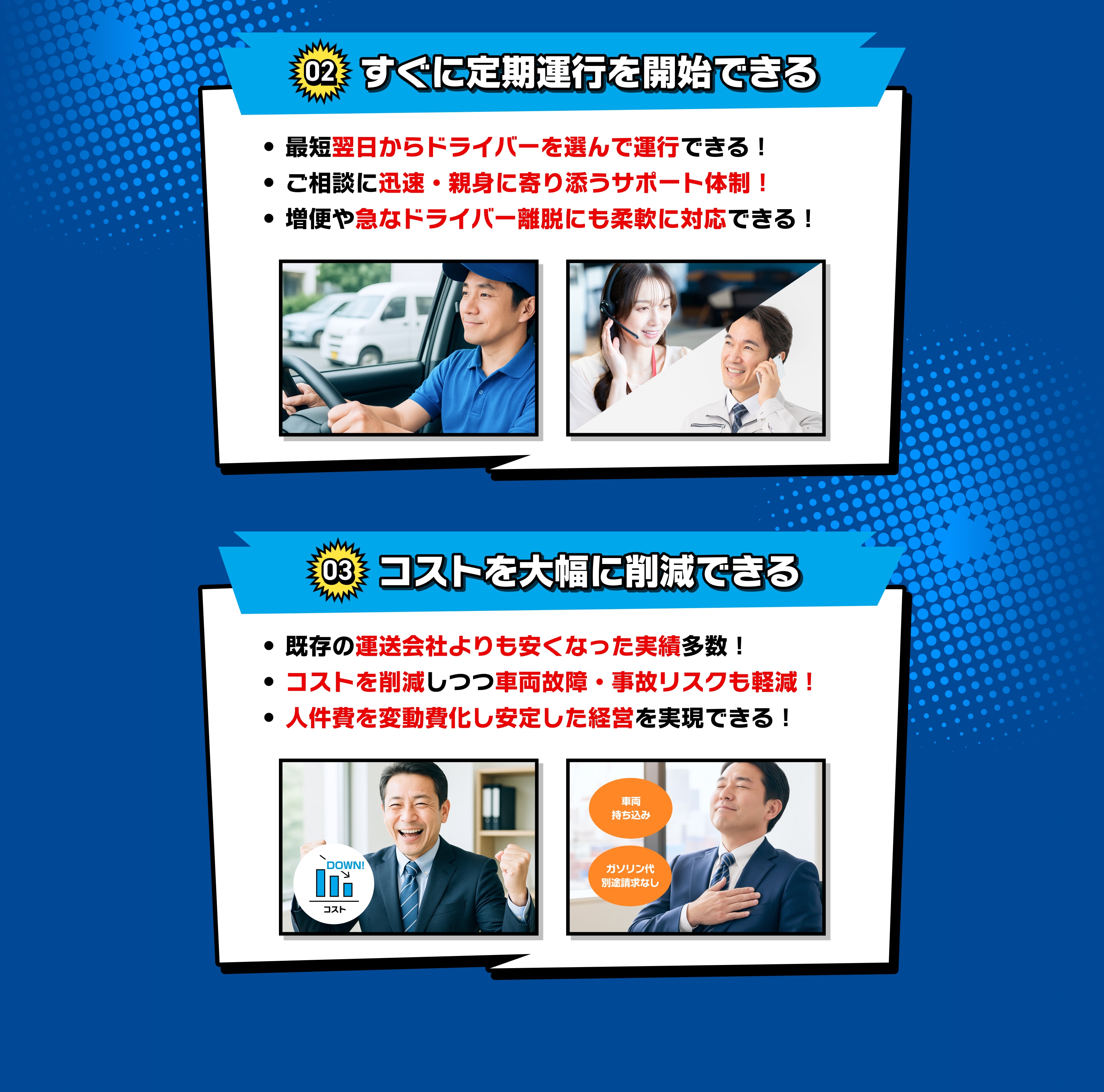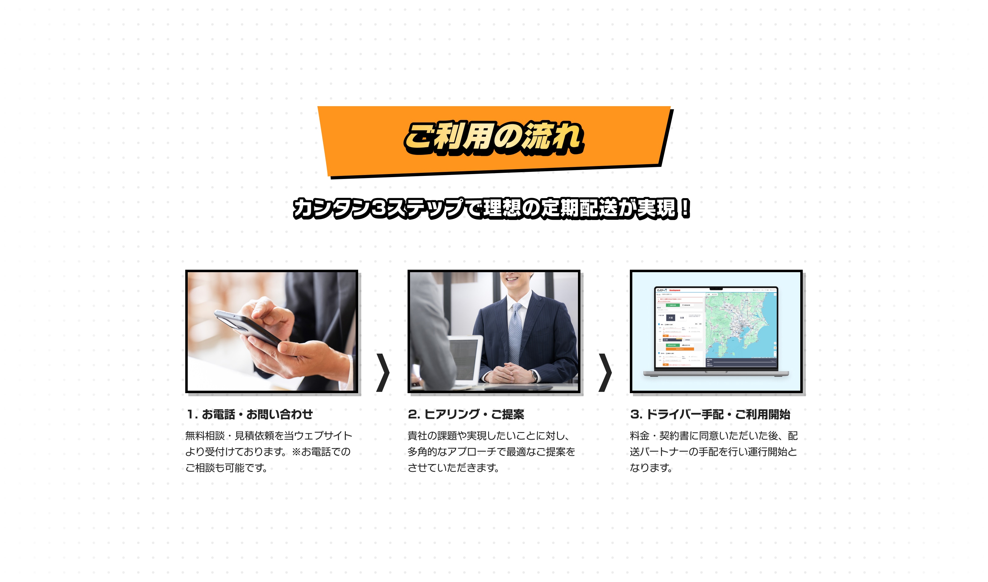 走行距離によって料金が決定する「距離制依頼」、運行時間によって料金が決定する「時間制依頼」がございます。荷物量ではなく、貸し切った車両1台単位で費用がかかります。定期便の場合、スポット便と異なり、配送頻度などを考慮し個別に料金を算出させていただきます。