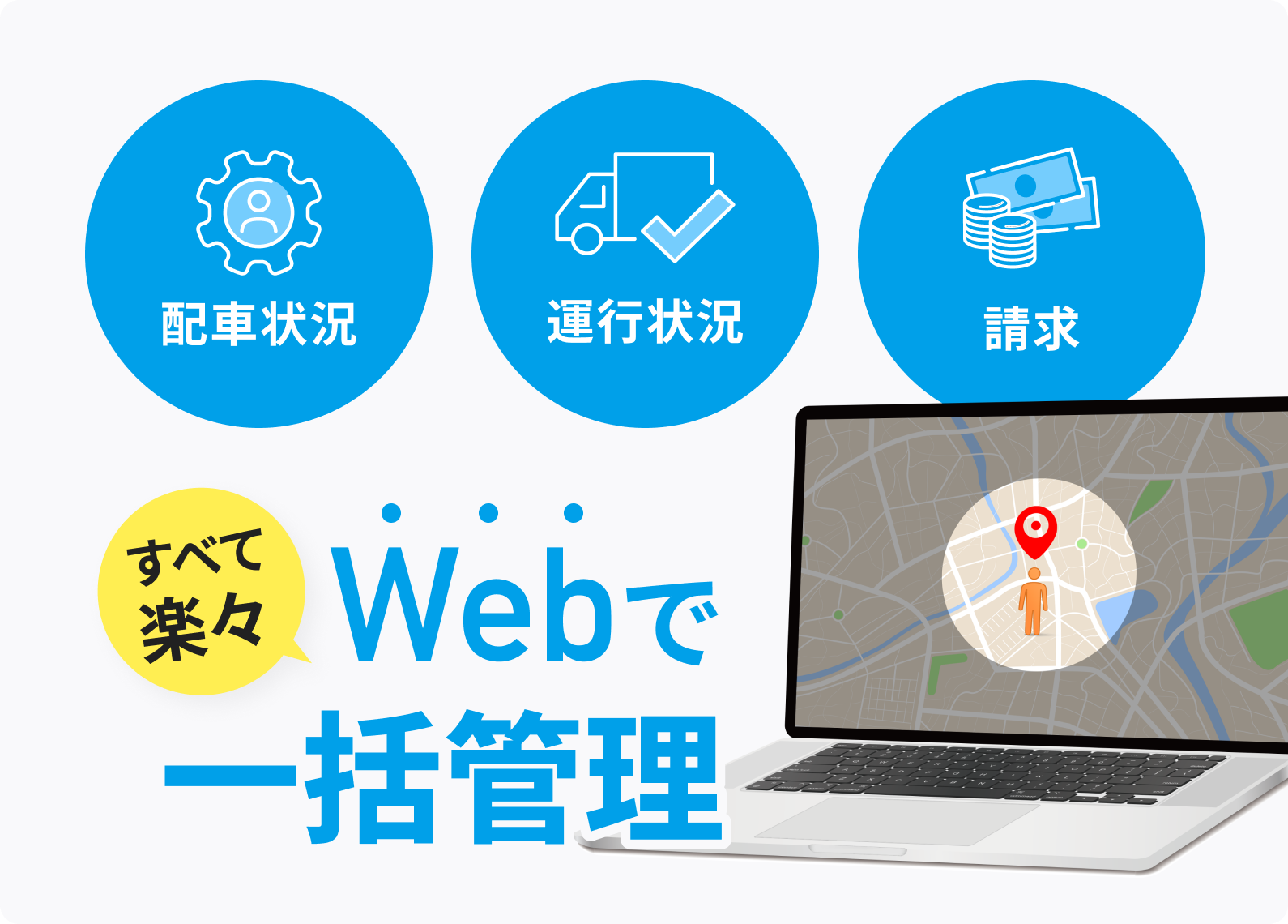 配車状況や運行の動態管理、さらには請求・支払いまでをWeb上で一元管理可能。